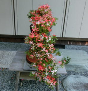 Each trunk of the three-trunked Nikko has a red flower on the left photo which was taken in June 2012. Therefore the colour-arrangement of flowers is very good. And the whole figure as a bonsai already looks beautiful because it had been planted in the bonsai pot since 2005.