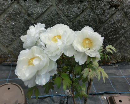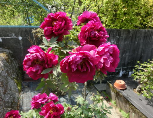 Since we gave some rose trees to one of our friends and sold a lot of them, I transplanted peonies and tree peonies in the place where a lot of the rose trees had been dug out last year. And their bottoms didn’t have the sun light in November, December and January. Therefore, these flowers are a little bit smaller than before. And I grew green onions and egg plants in the place where I had dug out peonies and tree peonies and we enjoyed water melons which were grown in other places where I had dug out a lot of rose trees. But we had to build the strong structures against monkeys lest they should rob us of them.