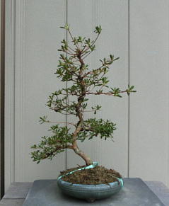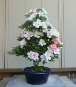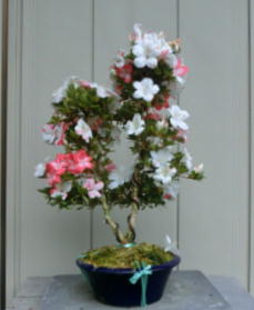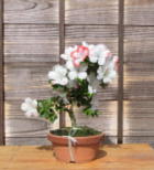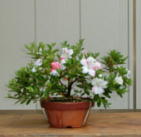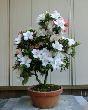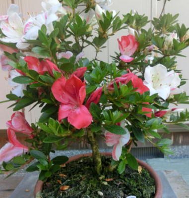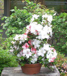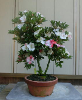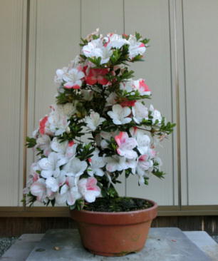 I took the second photo of the flowers on 31st May 2013. This tree has much better colour arrangement of flowers than before. I repotted it in a bonsai pot after wiring and pruning it. Therefore, the whole figure of this tree is very good when I took the third photo on 24th May 2016. But since it is not in full bloom, you cannot judge the colour arrangement of flowers perfectly. Unfortunately, the main trunk was broken by the May storm at the start of May 2017: it fell down from the shelf. You can see the miserable figure on the right photo which was taken on 29th May 2017.