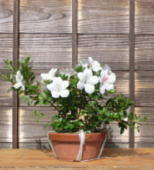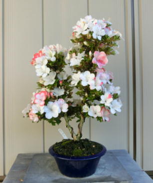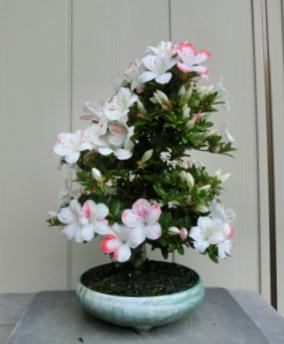 Since this Kogetsu G has been planted in a terracotta pot and the bottom of the trunk is a little bit thick on the left photo which was taken on 21st May 2016, it is about 9 years old. Though this tree has a lot of swelling flower buds, since it doesn’t have a lot of flowers, you cannot judge the whole colour arrangement of flowers at this point. But you can guess that it will have a good colour arrangement of flowers when it will be in full bloom. Though the style isn’t very good, these flowers are beautiful on the second photo which was taken on 29th May 2017. And the colour arrangement of flowers is good. The third photo is the whole figure of this tree when I repotted it in a bonsai pot on 18th March 2018. The style isn’t very good because the top is weak. Though I removed a lot of flower buds when repotting it, it has a lot of flowers whose colour arrangement is good.