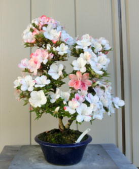 Though this Kogetsu H doesn’t have a lot of flowers, the colour arrangement of flowers is good on the left photo which I took on 21st May 2016. Therefore, though the style isn’t good, I decided to keep it to use it as a material in my web site. These flowers are beautiful on the second one which was taken 29th May 2017. And the style isn’t good because the trunk base line isn’t good on the third photo when I repotted it on 18th May 2018. Though I removed a lot of flower buds when repotting it, since it has a lot of flowers, you can judge that it has a good colour arrangement of flowers.