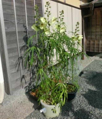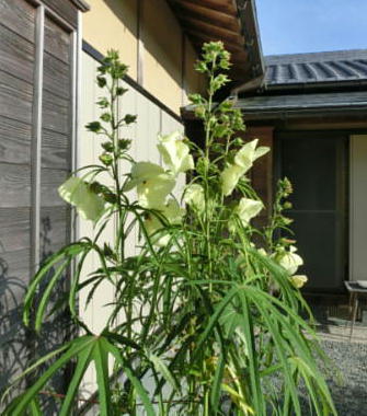 We cannot see these flowers in a lot of gardens of other people. Though this plant continues to have a lot of beautiful flowers for a long time, it grows so large in a large pot that it is difficult to carry it to the safe place when we have a typhoon. But it is popular in some people because it is the material for a medicine. If we sink the new flowers in the shochu (a kind of liquor) which has an alcohol concentration of 35 degrees, it is a good medicine for insect bites and cuts. I made some bottles. And the juice of roots is so sticky that it has been used to make Japanese paper since the old time.