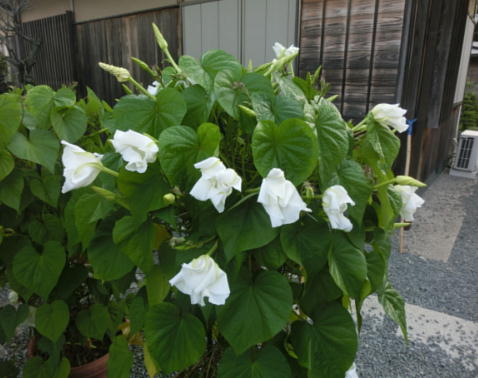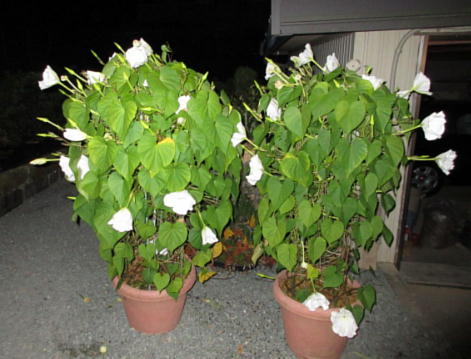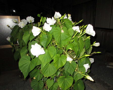 The flowers of gourd are unhappy because they are beautiful at night. Since it begins to flower at about 6:00 in the evening, though it spreads them at 6:30, the ends of petals bow because the air still keeps the very high temperature. Therefore, we have to go to see them at night with a light. Since I gave them fertilisers only twice, the leaves aren’t dark green.