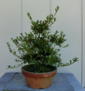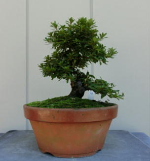 The colour-arrangement of these flowers isn’t very good though this tree has red and white flowers. Since this variety of Kegon has small leaves and flowers, it grows slower than other ones of the family of Nikko. Therefore, it doesn’t have a thick trunk though it may be 17 years old. But after trimming the style isn’t bad though it doesn’t have good windings. When I will consider a planting angle when I will repot it in a bonsai pot next year, I think it will look like a small bonsai.