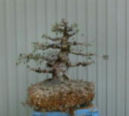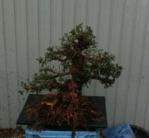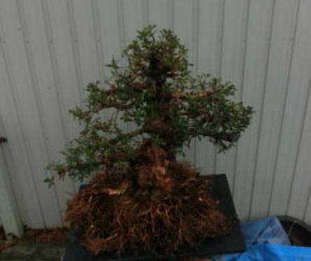 When I planted this tree in a large bonsai pot, after shaving the bark of the bottom of trunk, I planted a small sapling beside the bottom of its right side to make a root. The left photo is its front side, and the middle one is its back side. Since I cut two thick branches of the top because they had white flowers, the whole figure isn’t very good. Though the taper of the trunk is very good, the style isn’t so. And you can see several large scars on the right photo.