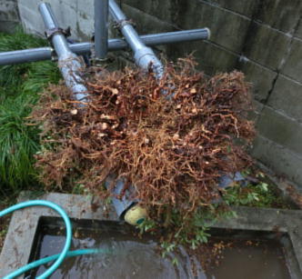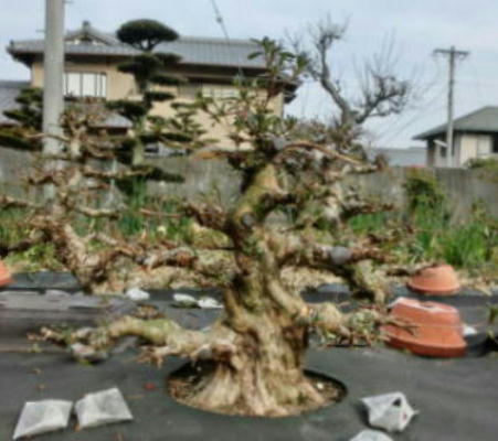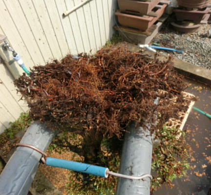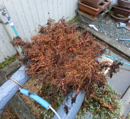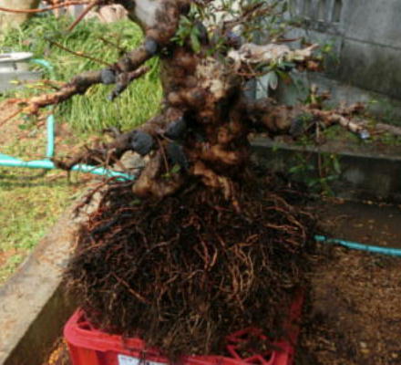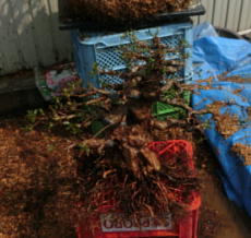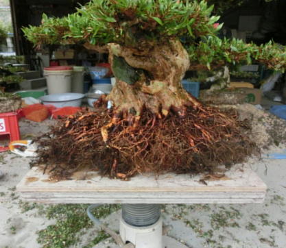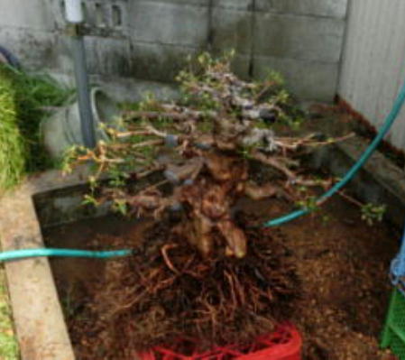 The left photo is the back side of nebari after cutting of the vertical roots. It doesn’t have any great problem. The second photo is the whole figure after washing roots completely. You can understand that this tree doesn’t have a very good nebari. The third one is the front side of this tree after repotting. Though the style is good, you can understand that the left side of the bottom of trunk is weak. Therefore, I decided to make some saplings to make the material which I would make a root by grafting it to the bottom of the trunk after planting it there. The right one is the back side. The height was 48 cm and the trunk girth was 45 cm.