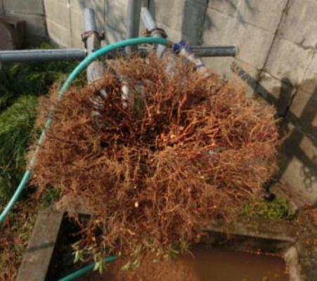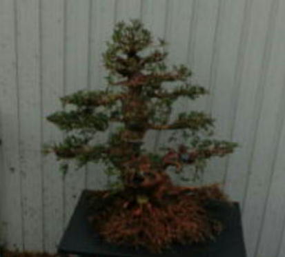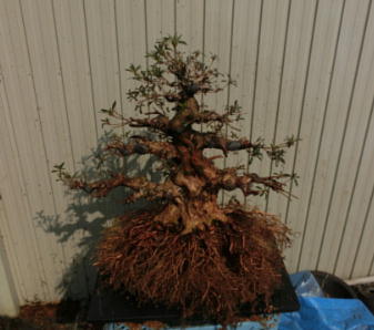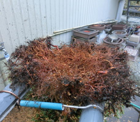 Since the nebari has a lot of small spaces between thick and thin roots on the back side of the root ball on the left photo, it has the perfect condition about a nebari. After I had washed all roots, this tree had so many roots on the second photo that I had to remove one tenth of them. And I planted it in a very large bonsai pot. The third photo is its front side and the right one is its back side. The whole figure is very good. The taper of the trunk is perfect, too. The height was 52 cm and the trunk girth was 42 cm. I thought that this tree was the best one that I had grown from the cutting.