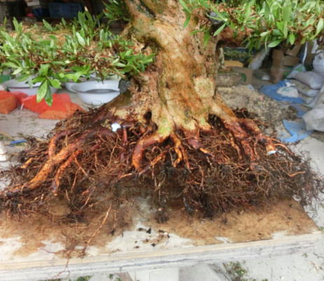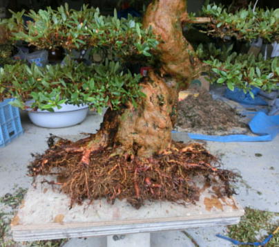 When I washed the roots of this tree on 30th March 2019, the back of the nebari is perfect because it has a lot of young roots even under the trunk and several spaces between thick roots on the left and second photos. And seeing the nebari from above, the front side is very good on the third and right photos.