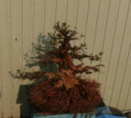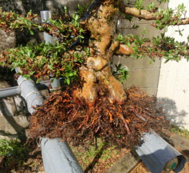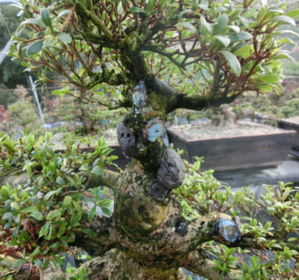 Though a large scar is seen on the bottom of the trunk on the third photo, you cannot see any one on the right photo. Since the branch above the scar died, it may have caused its dying. Since the trunk of this tree is the thickest of all satsuki trees that I have grown from the cuttings and one of my most favourite bonsai, my sense of loss is great. But I have to give up to make it grow strong now.