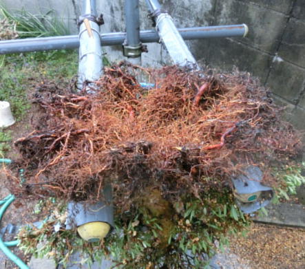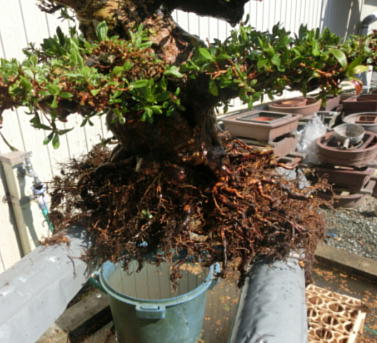 Since I already had cut two very thick branches below them, my new cutting was my error of thinking about the plan to make this tree have a good colour arrangement of flowers. Since the height was 49 cm and the trunk girth was 46, I shouldn’t have cut them, that is, I should have prioritised the life of this tree instead of my preference. Though I knew the fact that the bottom of the trunk was only 1 cm thick even if five years had passed since the previous repotting, I prioritised my preference. Since I decided to sell all middle and large bonsai and all trees in the nursery by the age of 85 in 2018, I had a strong desire to hand over satsuki trees as good as possible to satsuki enthusiasts. But now I think that this was my haughtiness because it is dying now.