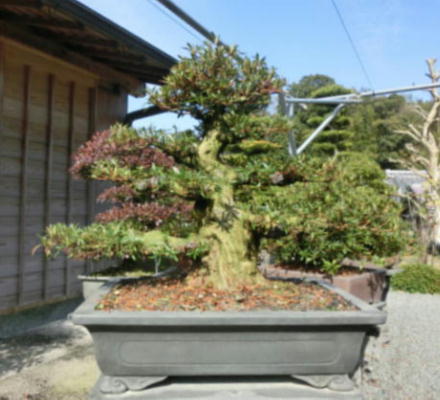 I have grown this Korin from the cutting. I broke the trunk when I wired it immediately after we had removed from Kobe to Ise in 1978. Though it was very tall, I cut it short and wired it again. Since I had a lot of such broken trees, I could not sell all of them at our flower show. Therefore, I continued to grow it in a terracotta pot. But since it was short, the trunk didn’t grow very thick. When I made the nursery in 1991, I planted it there. Though the trunk didn’t grow very thick for about 5 years, it began to grow very thick suddenly. I think that the roots around the bottom of the trunk became strong and healthy. You can see the whole figure after drastic pruning on 13th February 2013, whose nebari is very good on the left photo. Since you can see a lot of very long shoots on the second one which was taken on 26th January 2014, this tree was very strong and healthy.