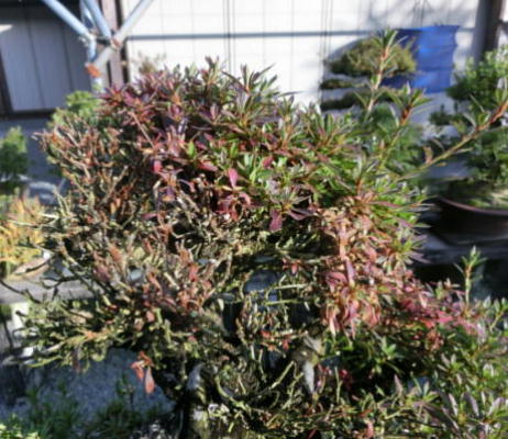 We have had the irregular and strange weather since about 2004, especially, the extreme heat in summer. Recently a lot of people lost their lives and fortunes in Japan when they continued to have the very heavy rain for some days. And the very great floods and heats afflicted a lot of people in the world. And all plants in the pots continued to have the great damage on the shelves in summer. Though I have the shadowing structure over satsuki trees in the pots on the shelves, some of them died every year. I think it is strange that some young trees or seedlings died because they are very strong when they are under the black nets in summer, if they had the same cares every year. Though my experience of satsuki trees is 49 years, I think it no longer may work. When I was at the age of 40s, I thought who made satsuki trees die and said so to my friends. Since my satsuki trees were young, they were so strong that they didn’t die even if I lent them to two persons.