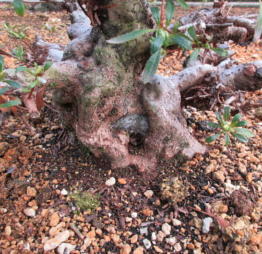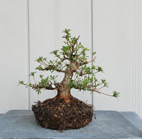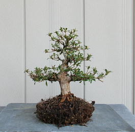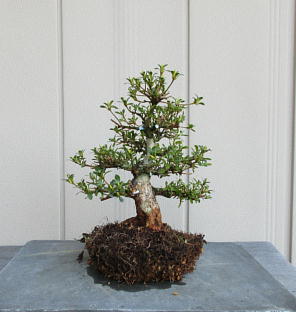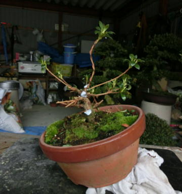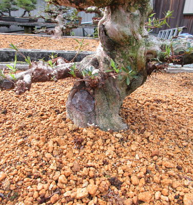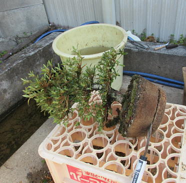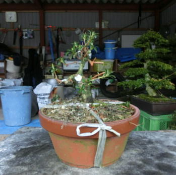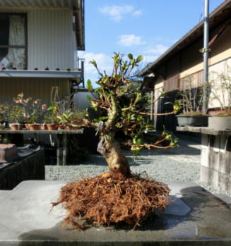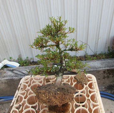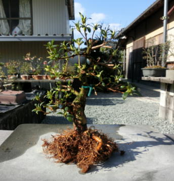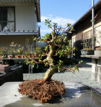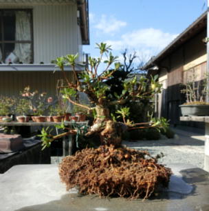 After cleaning the bottom of this tree with a bamboo stick and removing the hard soil on the surface of root ball with it, I removed the soil from the side and bottom of the root ball lightly to make new roots grow easily. These roots of this tree on the left photo were so good that I thought that I could make it have one fifth of flower buds. The middle photo is the figure after the root ball was washed. Though the style after repotting is not very good on the right photo now, if I will make the right first branch much longer and the left first branch shorter, the style will be much better.