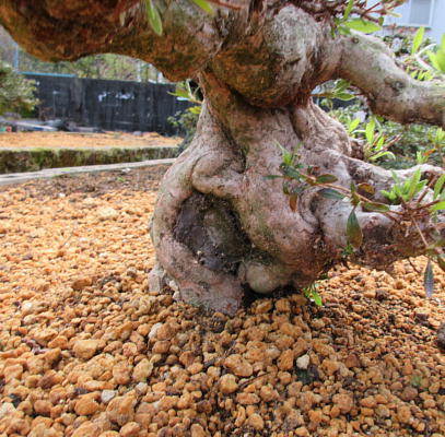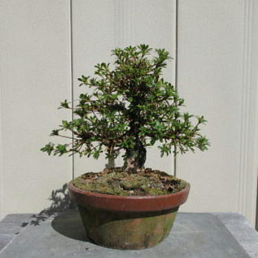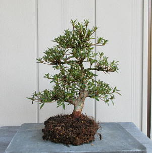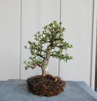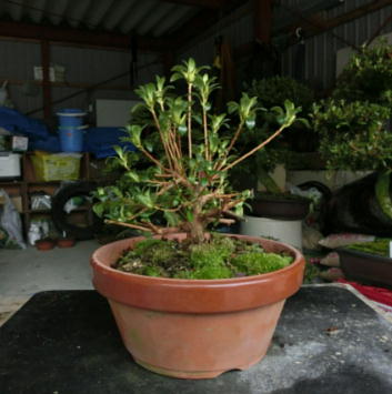 I have introduced these 8 small satsuki trees since when they were the saplings. Six of them are Nikko which have smaller leaves and others are Hikorin and Shuho-no-hikari. Since the bottoms of the trunks grew thicker and thicker, the styles are good. But I decided to change the pots to larger terracotta pots to make the bottoms of trunks much thicker after I cut one fourth of the root balls and the fine roots on the sides of them, cleaned the bottoms of the trunks with a bamboo stick and removed a little bit hard soil from the surfaces of the root balls to make water run through them easily on 19th March. Since I didn’t wash the roots after removing only hard soil on the surface of the root ball, I made each tree have about one fifth of the flower buds to enjoy their flowers. It is because the soil of the toot balls was not hard. If all soil was hard, we have to remove it completely and had better wash the roots.