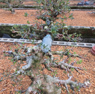 The left photo is Korin A which has a good taper of the trunk. The style isn’t bad and the bottom of the trunk is very thick. But such large satsuki trees isn’t popular in Japan now. A lot of satsuki enthusiasts like the various type of small satsuki bonsai because a lot of them are old. Since I am 80 years old, I am selling my middle and large satsuki bonsai and the satsuki trees in the nursery. The middle one is Korin B which has the good style. Though it has the very good taper of the trunk whose bottom is very thick on the middle one, it has a very large scar on the bottom of the trunk on the right one. It may not be repaired in 10 years. It is my great error. I should have cut the very thick branch about 25 years ago. But I was very busy at that time because I began to write a dissertation to get a title of doctor of literature. Therefore, I designed the chairman of Ise satsuki society and left it, too. And I couldn’t take good care for the trees in the nursery for several years. Fortunately, since I published a very thick book, I could get the title when I retired from Kogakkan university in March 2007.