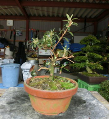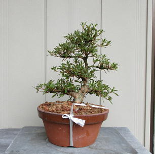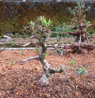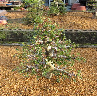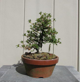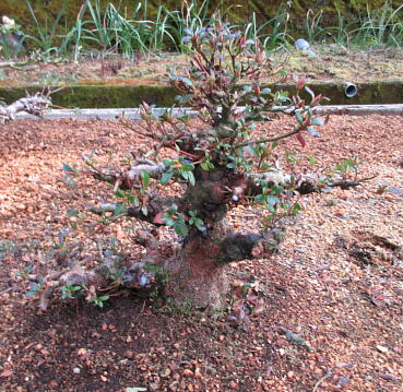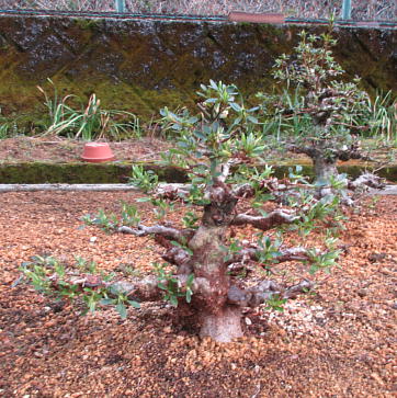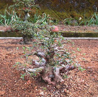 The left photo is the whole figure of this tree after I gave up styling in March 2015. But I removed some shoots and cut some branches short. Since its height was very low, the trunk seemed to be very thick on the middle one. And I changed the front side to the back when I repotted it in March 2020. When it had flowers in 2021, the colour arrangement isn’t bad on the right one,