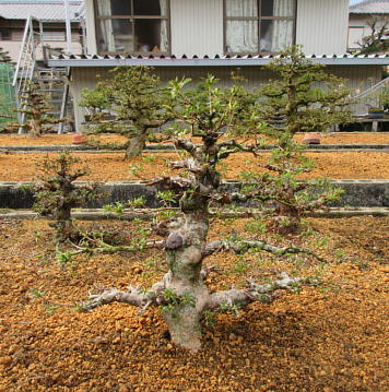 These small trees were transplanted from other places in the nursery in 2020, where it had been planted for more than 20 years. Therefore, the bottoms of their trunks are very thick though they are small. The left photo is Kozan B whose taper of the trunk is very good, but it has a middle size of scar on the bottom of the trunk which I hope will be healed in three years. You can see the scar on the second one clearly. The third one is Fujizakura whose style isn’t good. And the right one is Kobai whose right first branch is dying, but since the bottom of the trunk is very thick, I keep it.