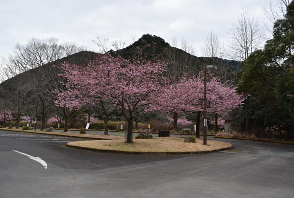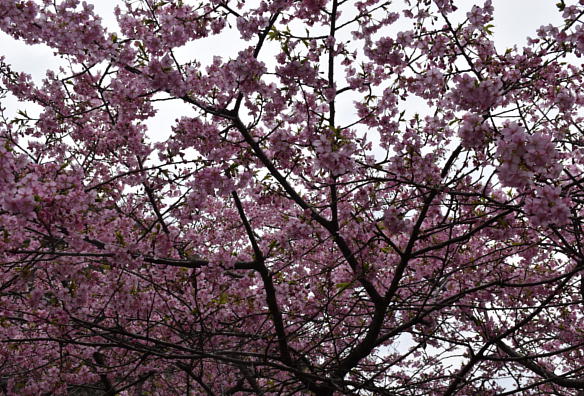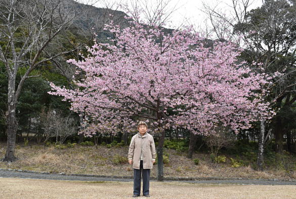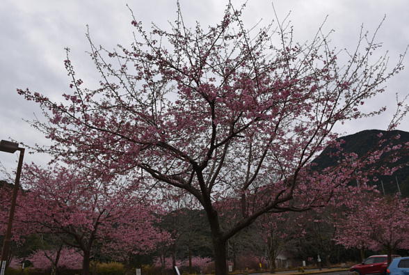 These photos are Kawazu cherry blossoms in Gonbee-no-sato park in Kihoku town in Mie prefecture. Though we can see a lot of beautiful flowers of a lot of cherry trees, since they have been planted in the very wide park and fields, and by the roads, the scenery isn’t gorgeous. The cherry tree which you can see behind me on the right photo is the parent tree from which a lot of saplings were made by cutting. Since the variety of Kawazu cherry was found about 30 years ago in Kawazu town Shizuoka prefecture, we cannot see a lot of Kawazu cherry blossoms in a lot of places. If some saplings were planted in the districts where it isn’t warm in winter, they don’t begin to have flowers much earlier than those of Someiyoshino which is the most popular variety of cherry.